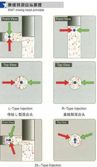 Two tilt the nozzle angle increases the collision kinetic energy of the material, the secondary mixed more fully, compared with traditional l-shaped mixing head with high mixing efficiency, which can guarantee a perfect product quality.