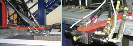 聚氨酯組分原料經過連續高壓發泡機的計量泵精密計量后,按照一定配比,被送入混合頭均勻地布料在復合板的底層面材上,并和上層面材同時被送入雙履帶層壓輸送機,聚氨酯泡沫在雙履帶層壓輸送機的上下輸送鏈板間發泡,并固定成型。待固定成型后,復合板在生產線上被自動跟蹤,切斷機按需切成一定長度的成品。